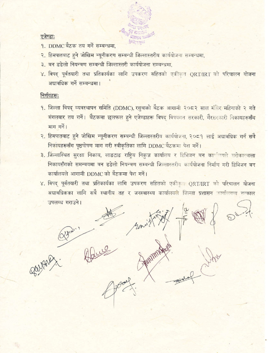 जिल्ला विपद् व्यवस्थापनको क्षेत्रमा क्रियाशील सरकारी र गै.स.स. निकायसँगको समन्वय बैठक निर्णय