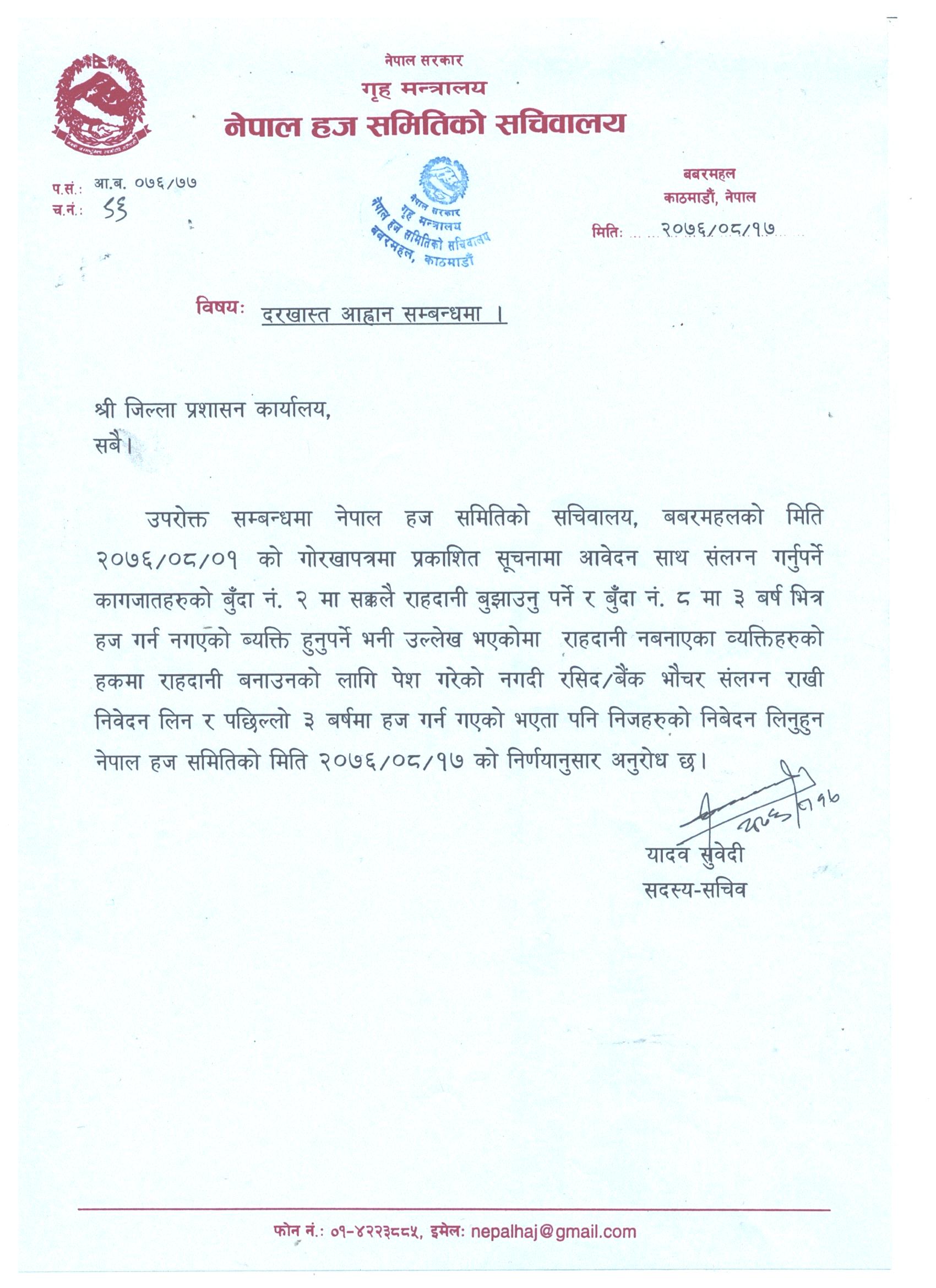 नेपाल हज समितिको सचिवालयको हज आवेदन फारम भर्ने म्याद थप गरिएको सूचना