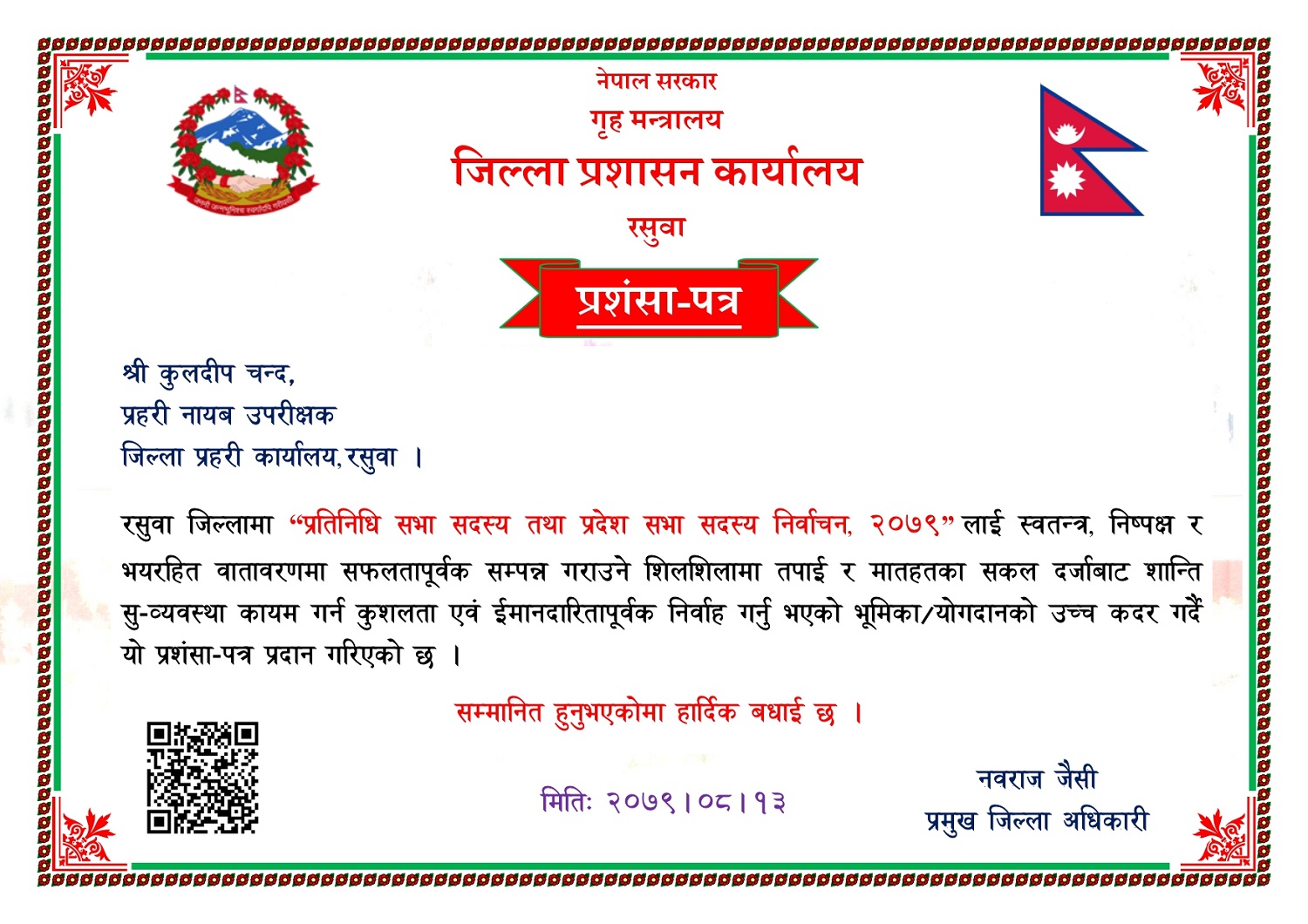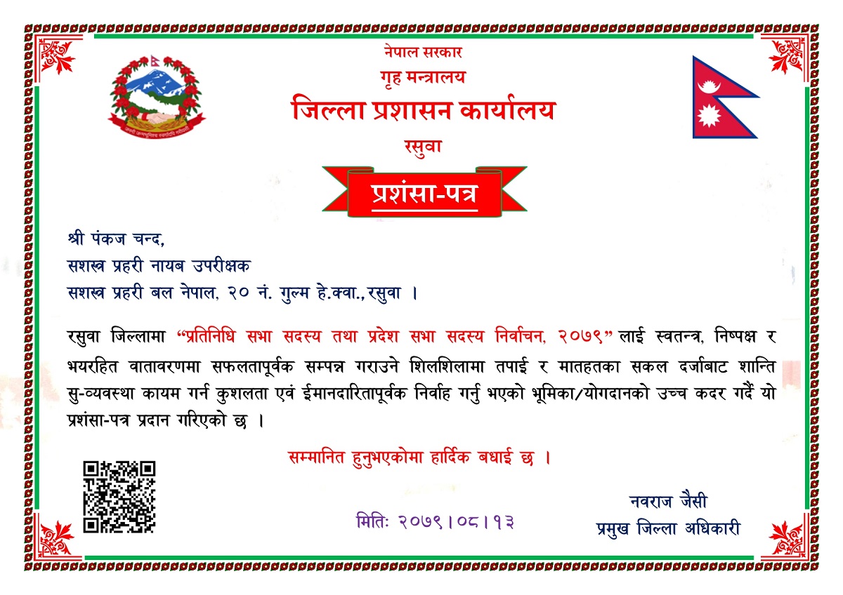 रसुवा जिल्लामा "प्रतिनिधि सभा सदस्य तथा प्रदेश सभा सदस्य निर्वाचन, २०७९" लाई स्वतन्त्र, निष्पक्ष र सफल रुपमा सम्पन्न गराउने निम्न कर्मचारीहरुलाई यस कार्यालयबाट प्रशंसा पत्र प्रदान गरिएको ।
