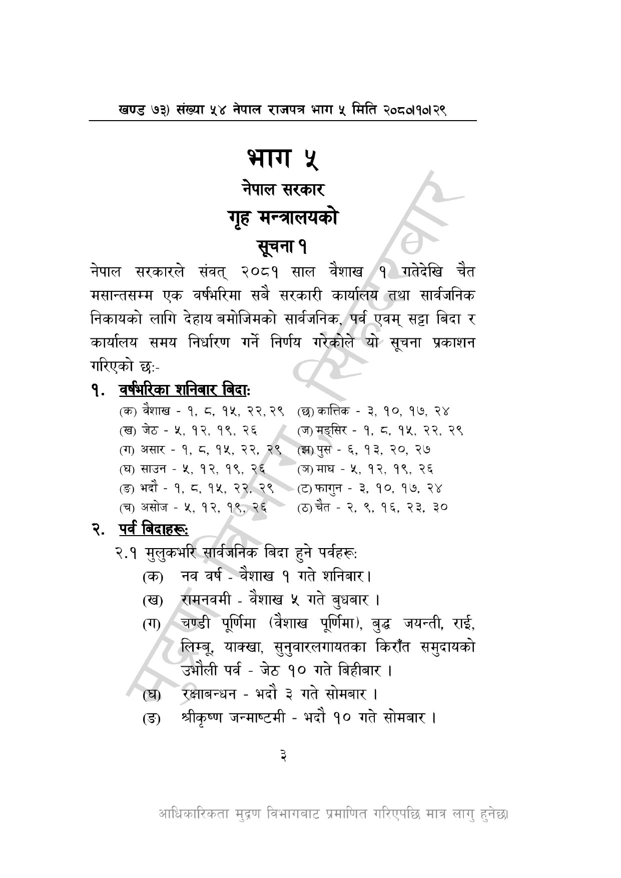 संवत् २०८१ सालको सार्वजनिक, पर्व एवं सट्टा विदा र कार्यालय निर्धारण सम्बन्धी गृह मन्त्रालयको सूचना