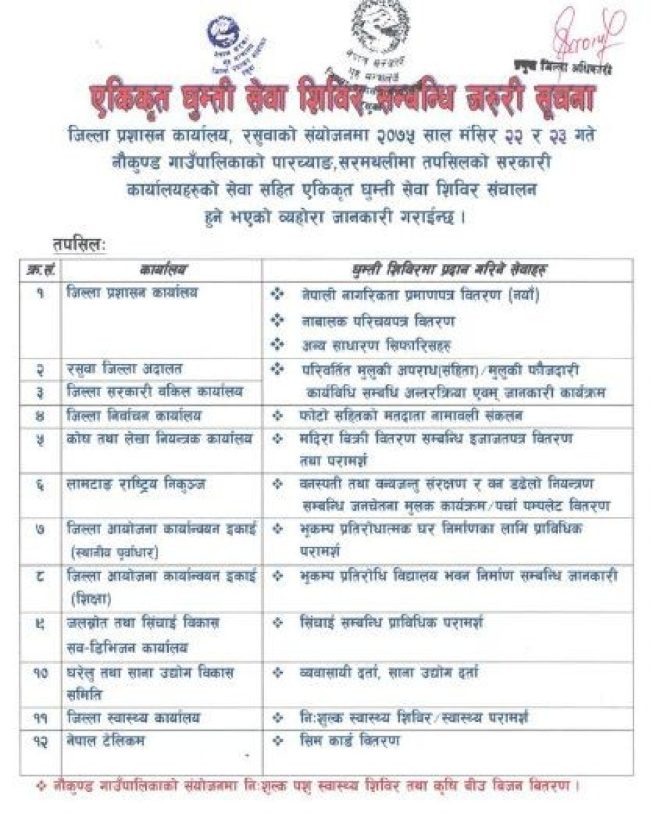 शिविरमा जिल्ला प्रशासन कार्यालय, रसुवा जिल्ला अदालत, जिल्ला सरकारी वकिल कार्यालय, लामटाङ राष्ट्रिय निकुञ्ज, जिल्ला निर्वाचन कार्यालय, घरेलु तथा साना उद्योग विकास समिति, नेपाल टेलिकम लगायत १२ सरकारी कार्यालयहरुबाट सेवा प्रदान गरिने व्यहोरा जानकारी गरार्इनछ ।