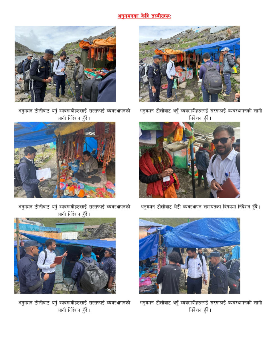 हरेक वर्ष जनैपूर्णिमाको अवसरमा गोसाइकुण्ड क्षेत्रमा लाग्ने मेलामा स्थानीय होटल तथा थर्पुहरुको सञ्चालन तथा व्यवस्थापनका सन्दर्भमा बारम्बार आएका गुनासोहरू सम्बोधन गर्नका लागि सहायक प्रमुख जिल्ला अधिकारीको नेतृत्वमा मिति २०८२।०४।१५-१९ गतेसम्म जिल्लास्थित सम्पूर्ण सुरक्षा संयन्त्र, लाङटाङ राष्ट्रिय निकुञ्ज कार्यालय, कोष तथा लेखा नियन्त्रक कार्यालय, गोसाइकुण्ड गाउँपालिका, रसुवाका प्रतिनिधि सहितको संयुक्त अनुगमन टोलीबाट गोसाइकुण्ड पदमार्ग क्षेत्रमा अवस्थित स्थानीय होटल तथा थर्पुहरुको अनुगमन सम्पन्न भएको छ। अनुगमनको क्रममा देखिएका कैफियत र सो बमोजिम गरिएको जरिवानको संक्षिप्त विवरण संलग्न छ।
