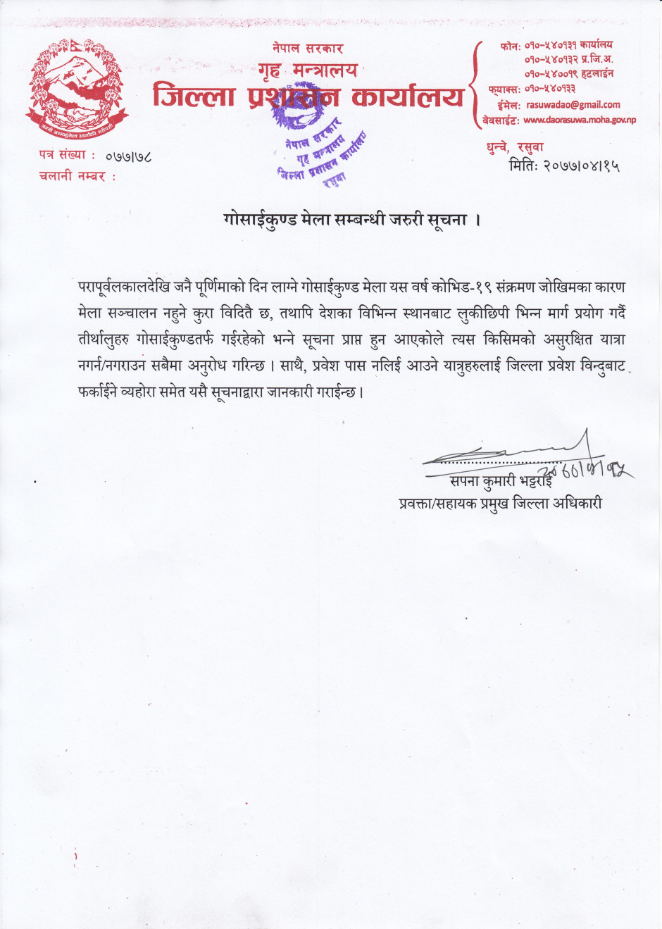 गोसाईकुण्ड मेला सम्बन्धी जरुरी सूचना