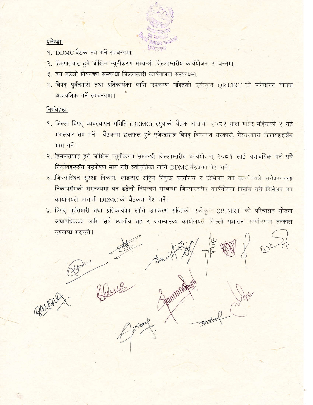 जिल्ला विपद् व्यवस्थापनको क्षेत्रमा क्रियाशील सरकारी र गै.स.स. निकायसँगको समन्वय बैठक निर्णय
