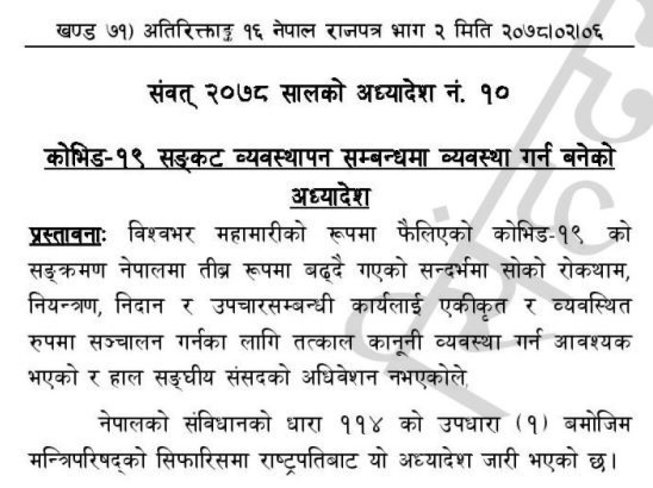 कोभिड-१९ सङ्कट व्यवस्थापन सम्बन्धमा व्यवस्था गर्न बनेको अध्यादेश, २०७८