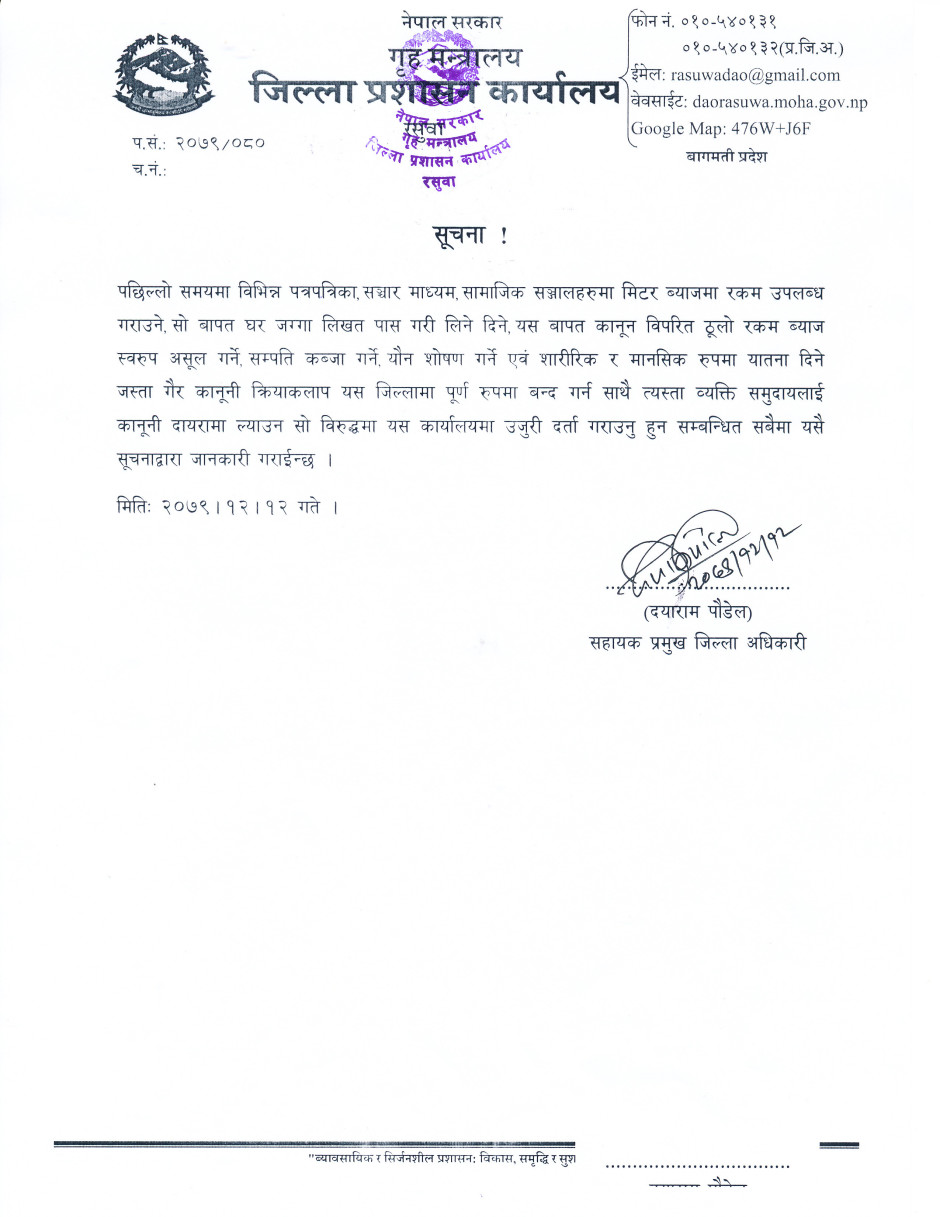 © सर्वाधिकार सुरक्षित जिल्ला प्रशासन कार्यालय, रसुवा