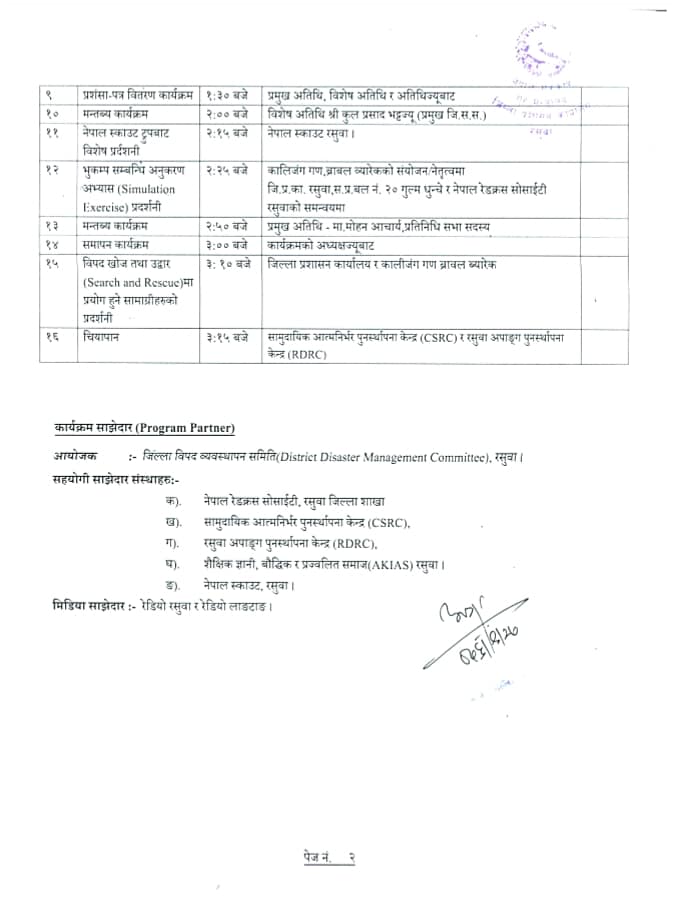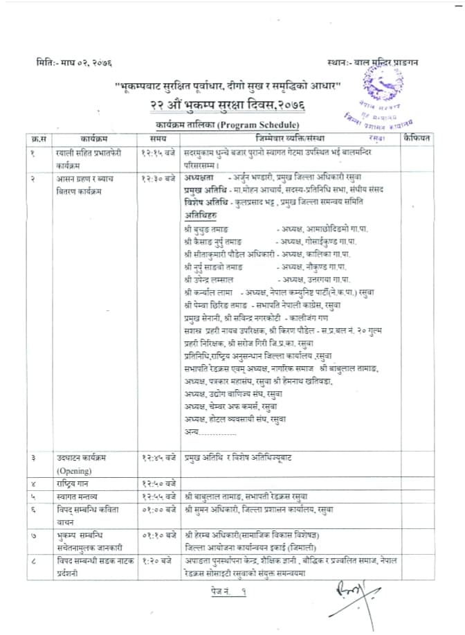 जिल्ला बिपद ब्यवस्थापन समिति, रसुवाको आयोजनामा र विभिन्न सरोकार संघसंस्थाहरूको सहयोगमा निम्न कार्यक्रम सहित मिति २०७६ माघ २ गते मनाईने २२ अौ भुकम्प सुरक्षा दिवसमा उपस्थित भईदिनुहुन सबै सरकारी तथा अर्ध सरकारी कार्यालय प्रमुखज्यूहरू तथा कर्मचारीहरू, स्थानीय तह पालिका प्रमुखज्यूहरू, गैरसरकारी निकाय प्रमुख प्रतिनिधिज्यूहरू, राजनीतिक पार्टी प्रमुखज्यूहरू, निजी, सहकारी संघसंस्था प्रमुख तथा प्रतिनिधिज्यूहरू, मा.बि./क्याम्पस प्राचार्य/बिधार्थी भाईबैनिहरू, जलबिधुत आयोजना प्रमुख/प्रतिनिधिज्यूहरू, सञ्चारकर्मिज्यूहरू, अामा समूह/क्लव, नागरिक समाज तथा सम्पूर्ण रसुवाबासीहरूमा हार्दिक अनुरोध गर्दछौं ।