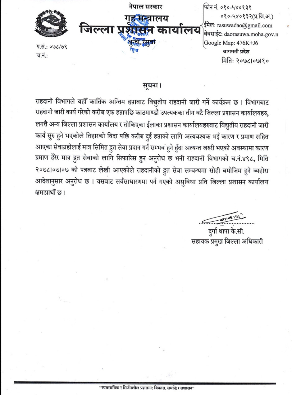 © सर्वाधिकार सुरक्षित जिल्ला प्रशासन कार्यालय, रसुवा