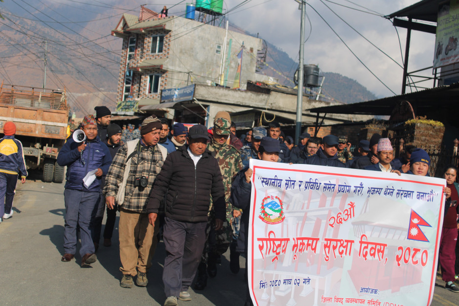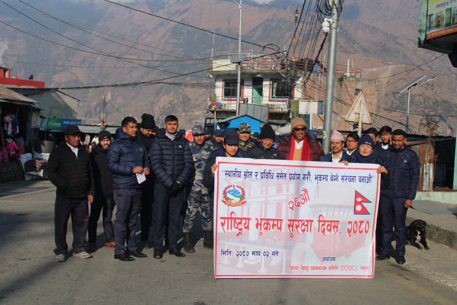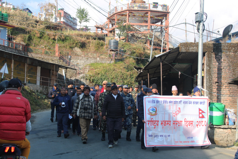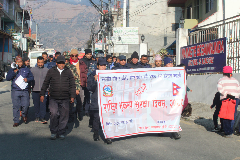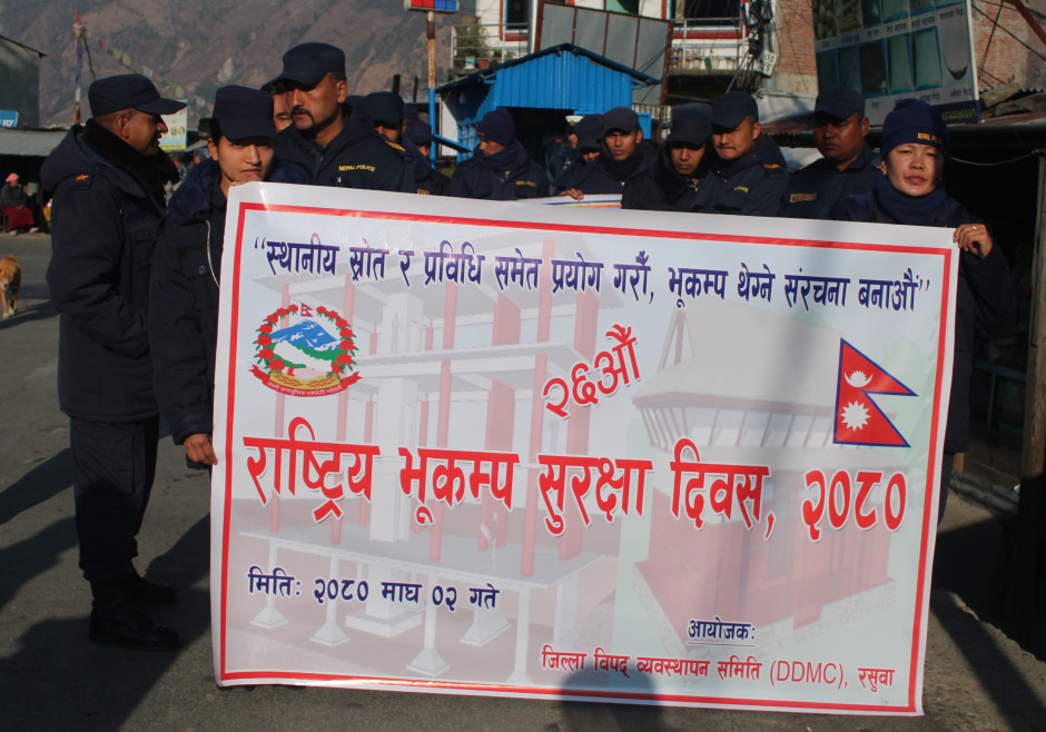 जिल्ला विपद् व्यवस्थापन समिति, रसुवाको आयोजनामा "स्थानीय स्रोत र प्रविधि समेत प्रयोग गरौ, भूकम्प थेग्ने संरचना बनाऔ" मूल नाराका साथ २६औ राष्ट्रिय भूकम्प सुरक्षा दिवस, २०८० को अवसरमा सचेतनामूलक प्रभातफेरी कार्यक्रम धुञ्चेबजारस्थित जिल्ला ट्राफिक प्रहरी एवं नेपाल प्रहरीको संयुक्त चेकप्वाईन्टबाट शुरुवात भई शिबमन्दिर घुम्तिमा प्रमुख जिल्ला अधिकारी एवं जिल्ला विपद् व्यवस्थापन समितिको अध्यक्ष श्री वेदनिधि खनालज्यूबाट सम्वोधन मन्त्वय सहित कार्यक्रम सम्पन्न भएको। कार्यक्रममा जिल्ला विपद् व्यवस्थापन समितिका पदाधिकारीहरु, स्थानीय सञ्चारकर्मी, जिल्लास्थित सरकारी कार्यालयका कार्यालय प्रमुख एवं प्रतिनिधि, राष्ट्रसेवक कर्मचारी, स्थानीयवासीहरुको सहभागिता रहेको थियो।