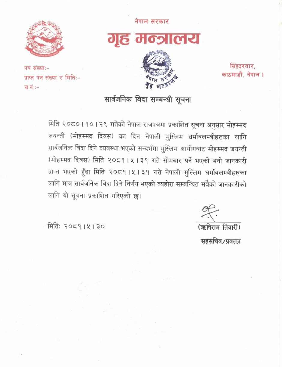 सार्वजनिक बिदा सम्बन्धी गृह मन्त्रालयबाट जारी सूचना (मोहम्मद दिवस, सम्बन्धित धर्मावलम्बीहरुका लागि मात्र)