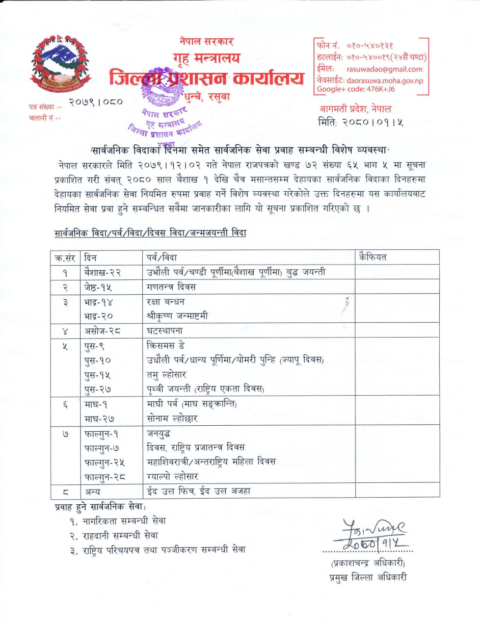 सार्वजनिक विदाको दिन समेत सेवा प्रवाह सञ्चालन रहने सम्बन्धी सूचना।