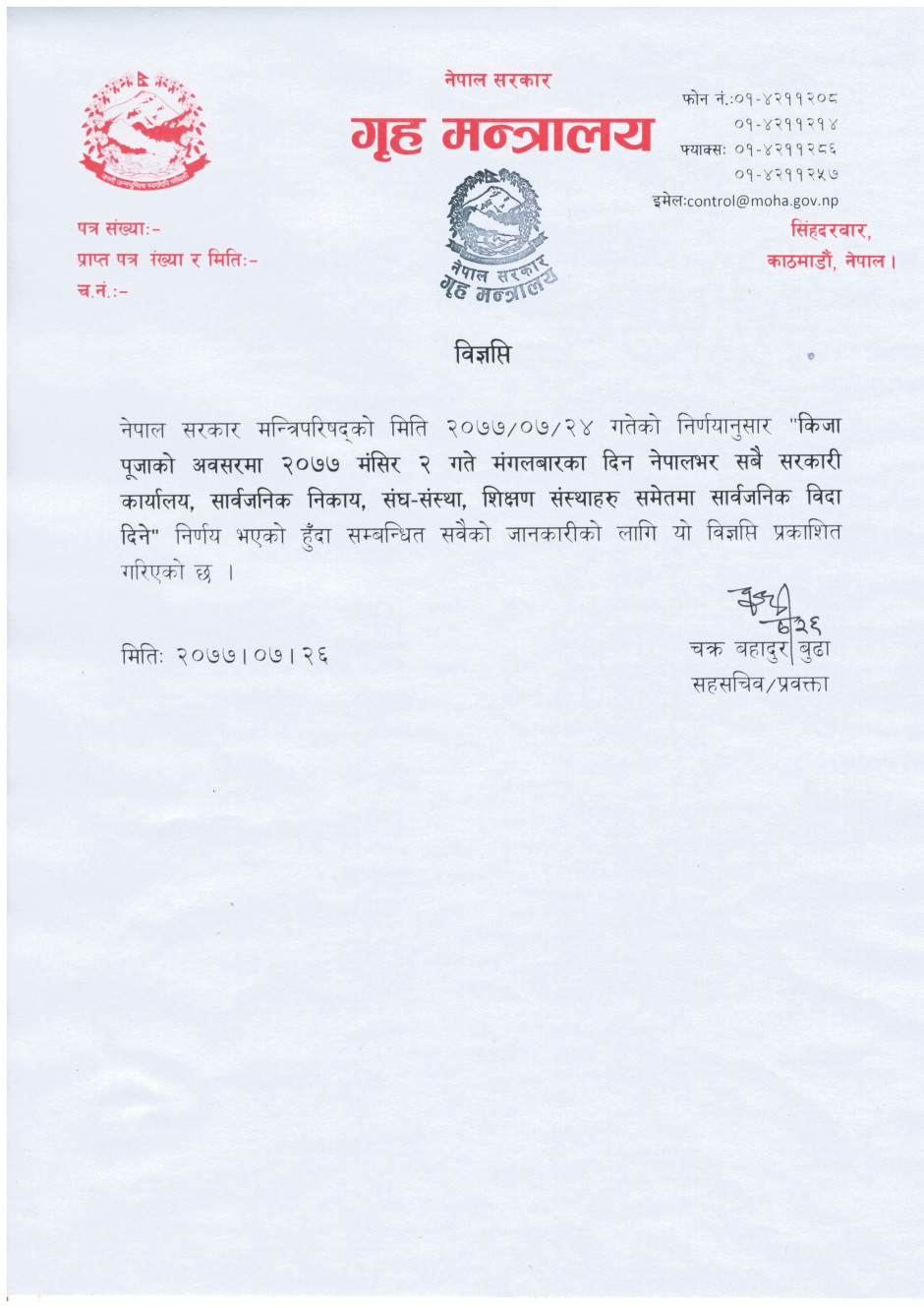 नेपाल सरकार मन्त्रिपरिषद्को मिति २०७७।०४।२४ गतेको निर्ययानुसार किजा पूजाको अवसरमा २०७७ मंसिर ०२ गते मंगलबार सार्वजनिक विदा सम्बन्धि गृह मन्त्रालयद्वारा जारी विज्ञप्ति
